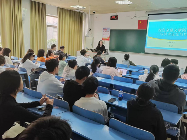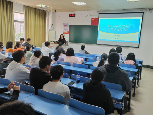 随后,李静老师讲解了论文的写作规范,尤其是对文献综述方面做了详尽深入的介绍,讲解了绿色金融文献阅读的要点以及高效阅读方法,如何有逻辑、规范地书写文献综述等问题,并借助文献综述向同学们传达了学术研究所具有创新型与突破性特征,即在现有的研究基础上进行创新与突破。